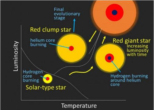 隨著(zhù)恒星的繼續演化,紅巨星中心的氦會(huì )積攢得越來(lái)越多,壓力和溫度也越來(lái)越高。終于在某個(gè)瞬間,氦核被點(diǎn)燃了,一個(gè)穩定燃燒的新心臟出現,恒星進(jìn)入了一個(gè)嶄新的階段——“紅團簇星”。和剛剛進(jìn)入“紅巨星”的恒星相比,這兩個(gè)年齡相差可達百萬(wàn)年的恒星從表面上看長(cháng)得幾乎完全相同。