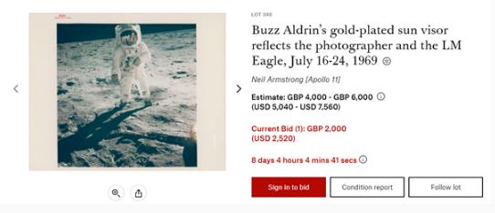 此外,作為第二個(gè)登陸月球的人,奧爾德林的一張照也將在此次拍賣(mài),拍賣(mài)預售估價(jià)在 5040 美元(約合人民幣 3.3 萬(wàn)元)到 7560 美元(約合人民幣 5 萬(wàn)元)。