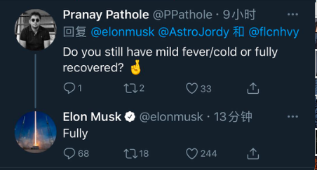 有網(wǎng)友詢(xún)問(wèn)馬斯克,是不是還在低燒?抑或是已經(jīng)完全康復(fully recovered)?馬斯克回答說(shuō),完全康復。