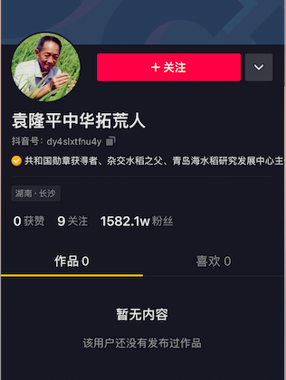 1 月 12 日,有媒體在抖音上搜索抖音號“袁隆平中華拓荒人”,已無(wú)法搜索到該賬號信息。