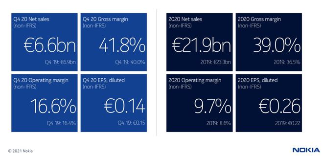 諾基亞日前正式公布 2020 年第四季度以及全年財報。數據顯示,諾基亞第四季度凈銷(xiāo)售額 65.68 億歐元,同比下降5%;全年凈銷(xiāo)售額 219 億歐元,同比下降6%。