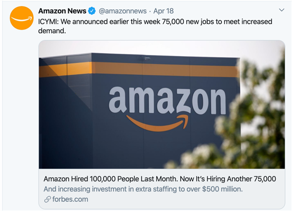 2020 年 3 月,美國勞工部公布的調查數據顯示,受新冠肺炎疫情在美國蔓延影響,各行業(yè)普遍停產(chǎn)停工,美國 3 月失業(yè)率從上月的 3.5% 升至 4.4%,非農業(yè)部門(mén)削減就業(yè)崗位 70.1 萬(wàn)個(gè),而亞馬遜電商業(yè)務(wù)由于線(xiàn)上訂單的需求激增,緊急擴充勞動(dòng)力,不斷增加勞動(dòng)崗位。