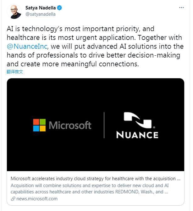 微軟首席執行官薩蒂亞·納德拉表示:“紐安斯在醫療保健交付點(diǎn)提供人工智能層,是企業(yè)人工智能在現實(shí)世界中應用的先驅。人工智能是技術(shù)領(lǐng)域最重要的優(yōu)先事項,醫療保健是其最緊迫的應用。隨著(zhù)我們加速微軟云在醫療保健和紐安斯領(lǐng)域的發(fā)展,我們將與合作伙伴一起,將先進(jìn)的人工智能解決方案交到世界各地的專(zhuān)業(yè)人士手中,以推動(dòng)更好的決策,創(chuàng )造更有意義的聯(lián)系。”