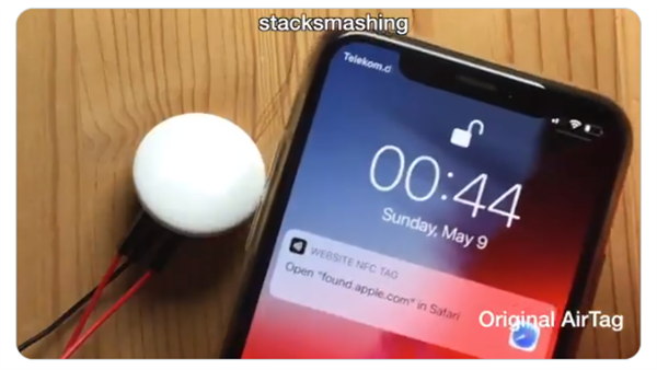 破解版 AirTag:由于入侵微控制器對 NFC URL 經(jīng)過(guò)了修改,因而會(huì )提示手機打開(kāi)一個(gè)自定義的 URL“stacksmashing.net”。