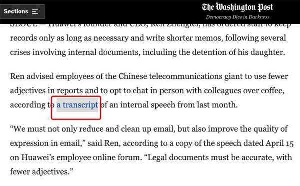 任何一個(gè)中國讀者通讀下華為發(fā)布的這個(gè)講話(huà)稿都會(huì )發(fā)現,它的目的就是要精簡(jiǎn)內部工作流程,提高效率。用通俗的話(huà)說(shuō):該保留的資料等保留,沒(méi)必要保留的一律廢掉。而到了《華盛頓郵報》這篇報道里,通過(guò)一定的背景添加,竟然成了“華為意欲隱瞞”的一個(gè)證據了。