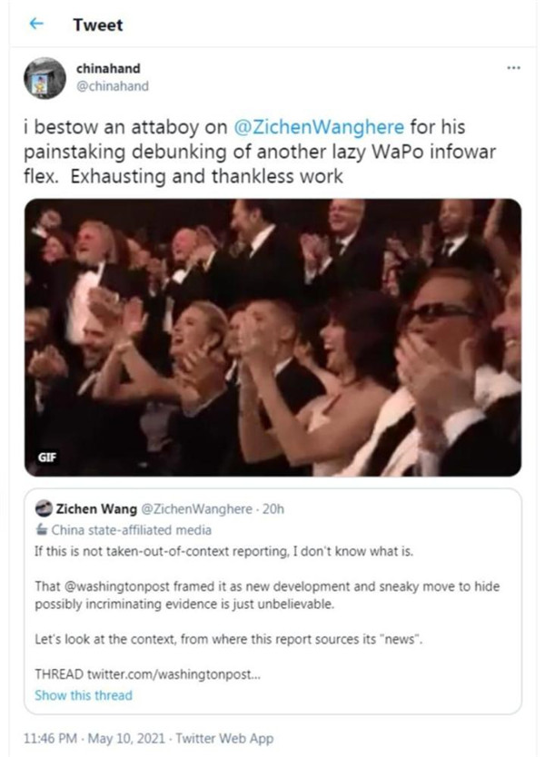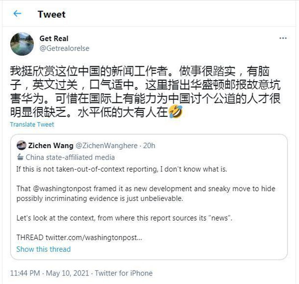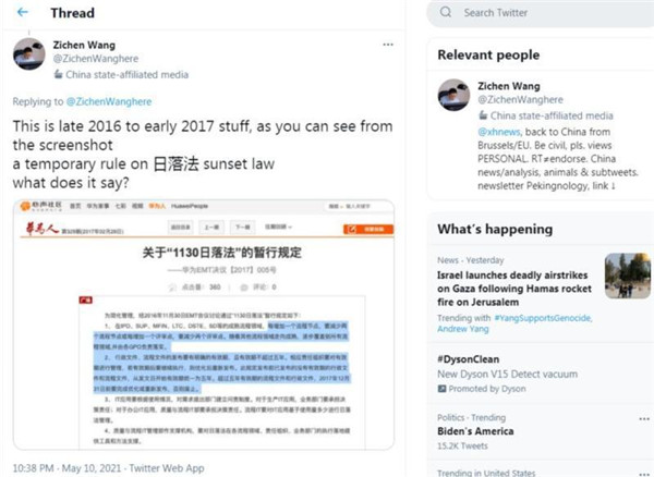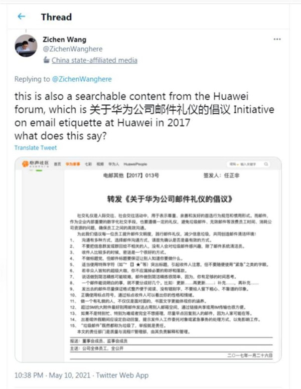 《華盛頓郵報》把報道在推特上發(fā)出后,新華社記者王子辰一小時(shí)之后就援引上述華為心聲社區內容連發(fā)15條系列推文予以反駁,對報道進(jìn)行了“迎頭痛擊”。