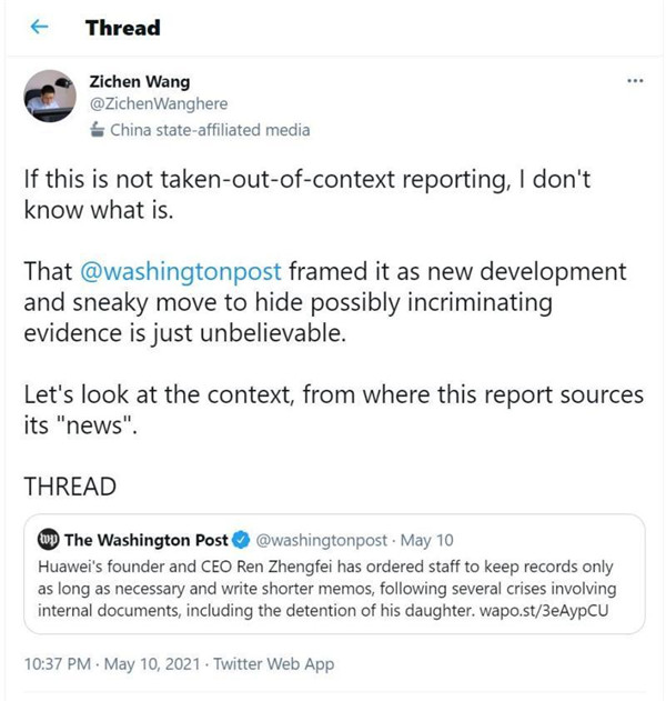 《華盛頓郵報》栽贓華為“意欲隱瞞”,新華社記者連發(fā)15條推文痛擊