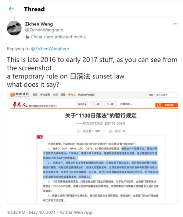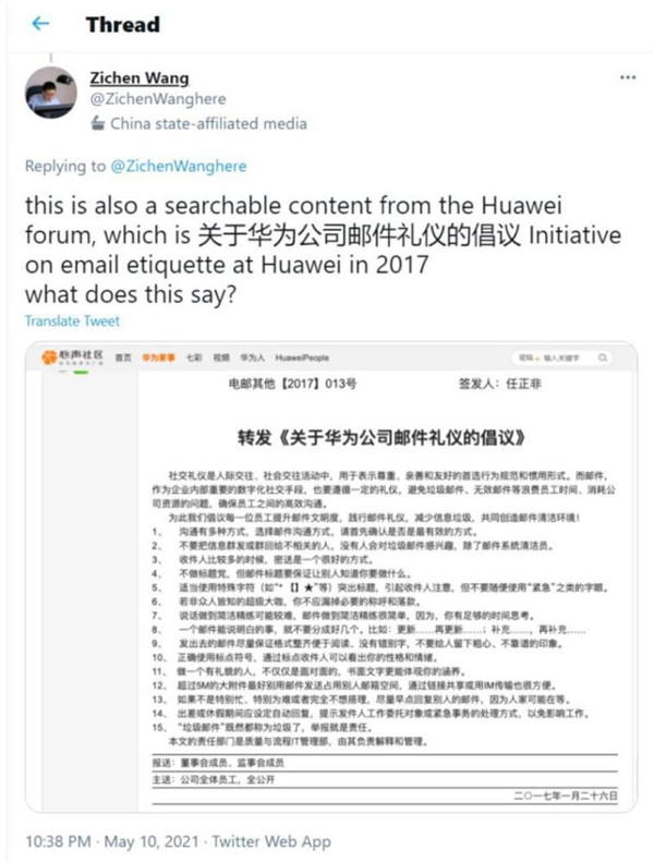 譯文:關(guān)于華為的系列推特——效率這個(gè)概念可能對他們太陌生了,以至于他們覺(jué)得一個(gè)有理有據的(華為內部)政策是反常的。