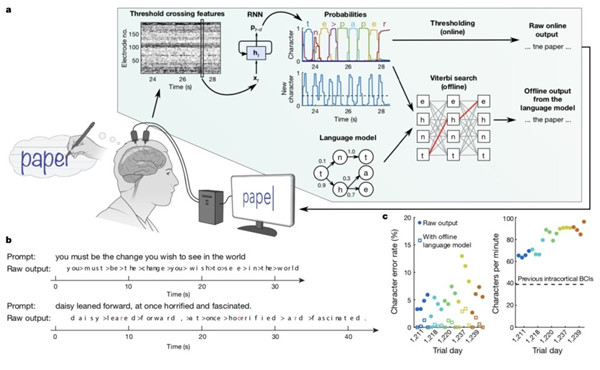 北京時(shí)間5月12日晚間,頂級學(xué)術(shù)期刊《自然》(Nature)以封面文章的形式刊發(fā)了由斯坦福大學(xué)、布朗大學(xué)、哈佛醫學(xué)院等團隊的研究人員聯(lián)合完成的一項里程碑式研究,題為“High-performance brain-to-text communication via handwriting”。該研究回歸到古老的表達自方式——手寫(xiě),首次解碼了與書(shū)寫(xiě)有關(guān)的神經(jīng)信號,并實(shí)時(shí)顯示它們。
