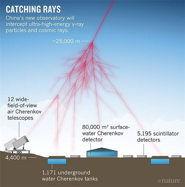 圖注:高能粒子產(chǎn)生大氣簇射,LHAASO各探測器對簇射的觀(guān)測(示意圖)來(lái)源:《自然》雜志。