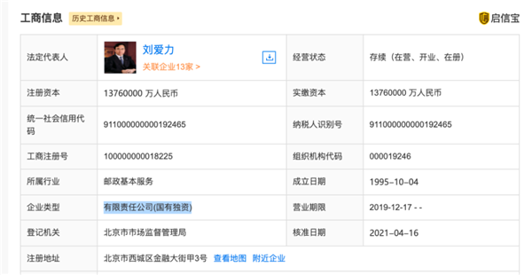 另?yè)⑿艑殧祿@示,中國郵政集團由國務(wù)院100%控股,成立于1995年,注冊資本為1376億元,法人代表是劉愛(ài)力。