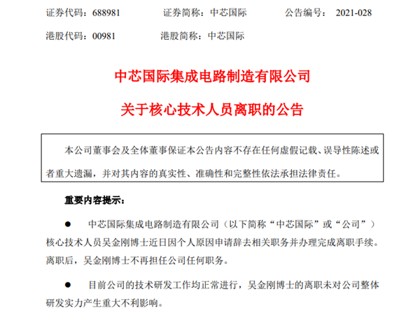 7月4日晚間,中芯國際公告稱(chēng),該公司核心技術(shù)人員吳金剛博士近日因個(gè)人原因申請辭去相關(guān)職務(wù)并辦理完成離職手續。離職后,吳金剛博士不再擔任公司任何職務(wù)。