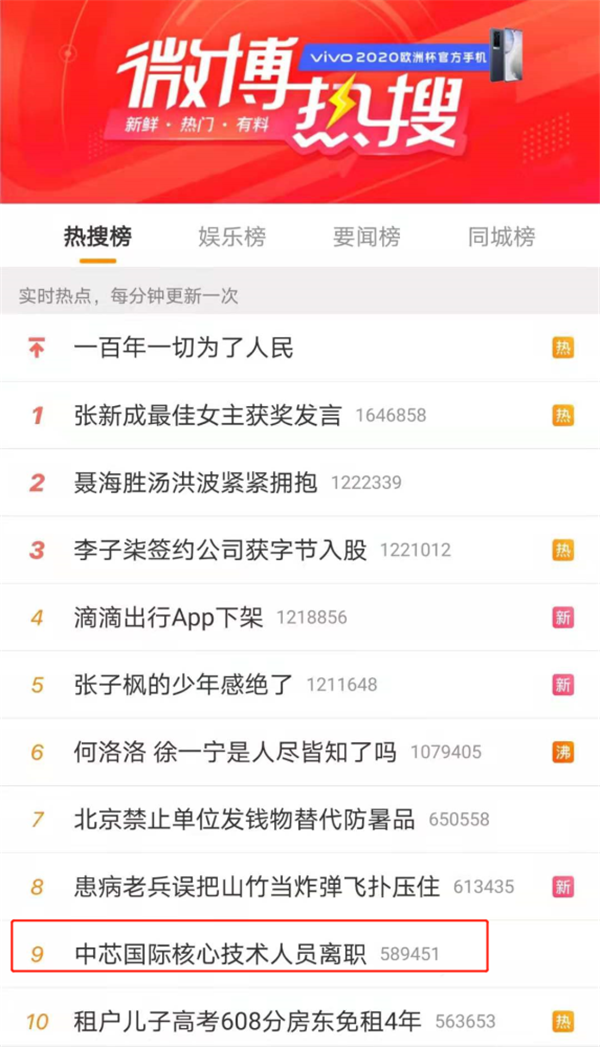 在新浪微博上,中芯國際核心技術(shù)人才離職,更是沖上了熱搜。