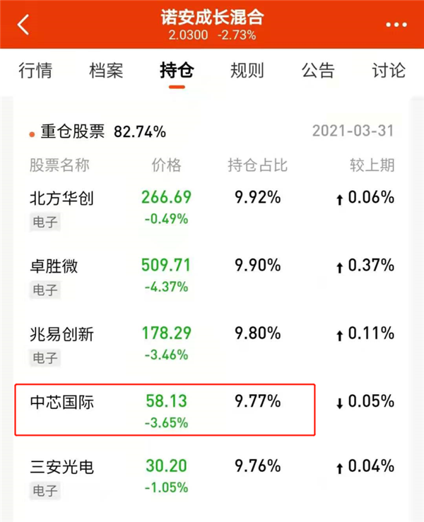 根據諾安成長(cháng)混合基金的最新持倉顯示,中芯國際是其第四大重倉股。