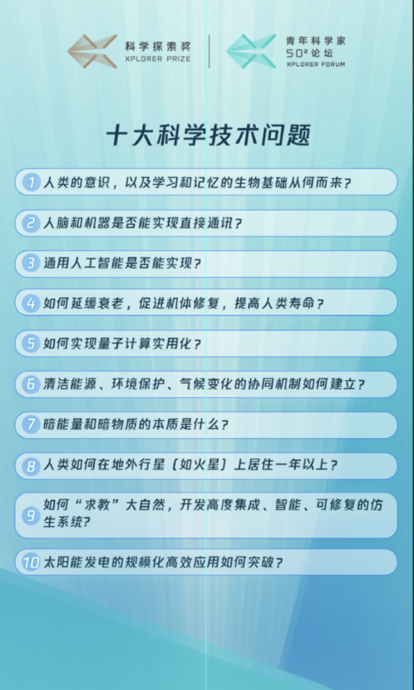 本次活動(dòng)的一個(gè)亮點(diǎn),就是發(fā)布2021年青年科學(xué)家50 論壇“十大科學(xué)技術(shù)問(wèn)題”,由100位“科學(xué)探索獎”獲獎?wù)吖餐l(fā)起和投票選出,代表了中國青年科技工作者的前沿科學(xué)洞察,問(wèn)題涵蓋人類(lèi)意識、人機通訊、量子計算實(shí)用化、地外行星居住等學(xué)術(shù)界和社會(huì )共同關(guān)心的熱點(diǎn)領(lǐng)域。主辦方表示,“十大科學(xué)技術(shù)問(wèn)題”的發(fā)布,未來(lái)將成為“青年科學(xué)家50 論壇”的“招牌”,既集聚中國當代青年科學(xué)家的思考和觀(guān)察,也將為社會(huì )大眾所關(guān)心的現實(shí)和未來(lái)問(wèn)題提供科學(xué)映照。