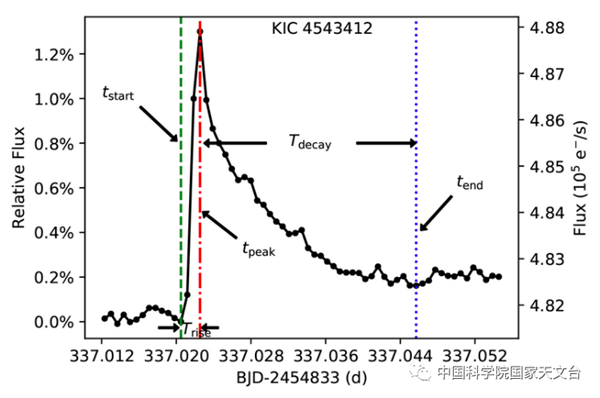 圖4. 發(fā)生在KIC 4543412恒星上一次耀發(fā)的經(jīng)典光變輪廓(圖源:Yan Y. et al., 2021, MNRAS, 505, L79)