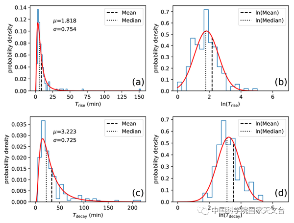 圖5. 左側為耀發(fā)樣本上升相時(shí)間和下降相時(shí)間的對數正態(tài)分布圖,右側為上升相時(shí)間和下降相時(shí)間各自取對數后的正態(tài)分布圖(圖源:Yan Y. et al., 2021, MNRAS, 505, L79)