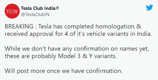 該網(wǎng)站還表示,這些測試確保了車(chē)輛在排放、安全性和道路方面符合印度市場(chǎng)的要求。同時(shí)特斯拉粉絲俱樂(lè )部已在推特上公布了這一重要進(jìn)展,這些獲準車(chē)型可能包括 Model 3 和 Model Y 。