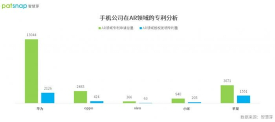 根據智慧芽全球專(zhuān)利數據庫顯示,截至9月16日,華為、OPPO、vivo、小米、蘋(píng)果五家手機公司及其關(guān)聯(lián)公司均已在A(yíng)R領(lǐng)域進(jìn)行專(zhuān)利布局。具體來(lái)看,這些公司分別已公開(kāi)的AR領(lǐng)域專(zhuān)利申請量分別為13044件、2483件、366件、940件、3671件,其中授權發(fā)明專(zhuān)利占比分別約為16.3%、17.1%、17.2%、21.8%、42.3%。