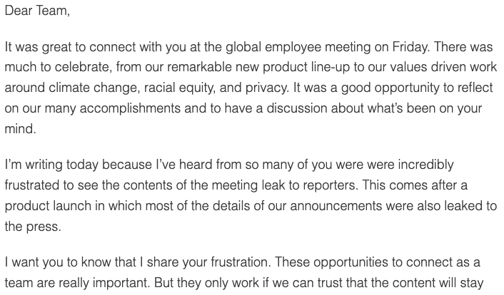 另外,蘋(píng)果在 9 月 17 日舉行了一場(chǎng)全體員工大會(huì ),要求對未接種疫苗的員工進(jìn)行頻繁檢測,但沒(méi)有強制要求接種疫苗。不料,這場(chǎng)大會(huì )的內容也被泄露給了媒體。