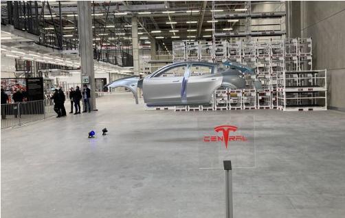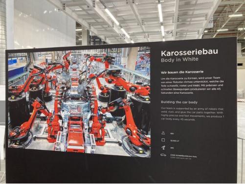 特斯拉柏林工廠(chǎng)的告示牌上寫(xiě)道:“我們的團隊獲得了機器人大軍的鼎力支持,這些機器人可以執行焊接、鉚接和粘合汽車(chē)部件等任務(wù)。憑借超高的精度和快速的運動(dòng),我們每隔 45 秒就能生產(chǎn)一輛 Model Y 車(chē)身。”