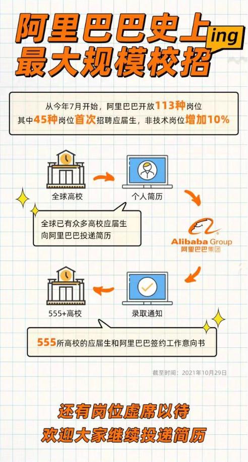 10 月 29 日消息,今年 7 月,阿里巴巴啟動(dòng)了史上最大規模校招。截至 10 月 29 日,全球眾多高校應屆畢業(yè)生向阿里投遞了簡(jiǎn)歷,其中來(lái)自 555 所高校的應屆畢業(yè)生已與阿里巴巴簽署工作意向書(shū),喜提錄取通知。