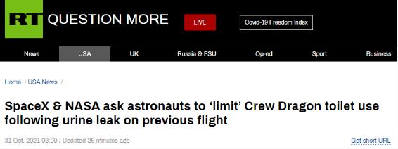 美國“龍”飛船廁所漏尿,有“解決辦法”了?據“今日俄羅斯”(RT)31 日報道,美國太空探索技術(shù)公司(SpaceX)在國際空間站上的“龍”飛船預計于下月返回地球,面對眾所周知的廁所故障問(wèn)題,美國國家航空航天局(NASA)和 SpaceX 公司有了“辦法”,他們告知“龍”飛船上的四名宇航員,應減少使用廁所,此外還應穿著(zhù)“特殊內衣”,以便處理排泄物。