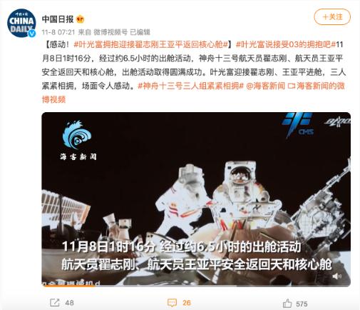 據中國載人航天工程辦公室消息,北京時(shí)間 2021 年 11 月 8 日 1 時(shí) 16 分,經(jīng)過(guò)約 6.5 小時(shí)的出艙活動(dòng),神舟十三號航天員乘組密切協(xié)同,圓滿(mǎn)完成出艙活動(dòng)全部既定任務(wù),航天員翟志剛、航天員王亞平安全返回天和核心艙,出艙活動(dòng)取得圓滿(mǎn)成功。