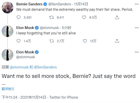 馬斯克回應桑德斯的推文稱(chēng),“我一直忘了你還活著(zhù)呢”。在隨后一條推特中,馬斯克問(wèn):“伯尼,想讓我賣(mài)出更多股票嗎?直說(shuō)好了……”