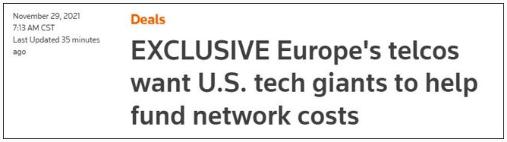 據路透社 11 月 29 日報道,11 家歐洲電信公司,包括德國電信(DTEGn.DE)、沃達豐(VOD.L)等大型歐洲電信企業(yè)的首席執行官稱(chēng),美國科技巨頭應該承擔歐洲電信網(wǎng)絡(luò )的部分費用,因為這些公司耗費的流量太多了。