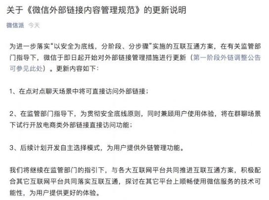 11 月 29 日消息,微信官方賬號“微信派”今日發(fā)布關(guān)于《微信外部鏈接內容管理規范》的更新說(shuō)明,于即日起開(kāi)始對外部鏈接管理措施進(jìn)行更新。