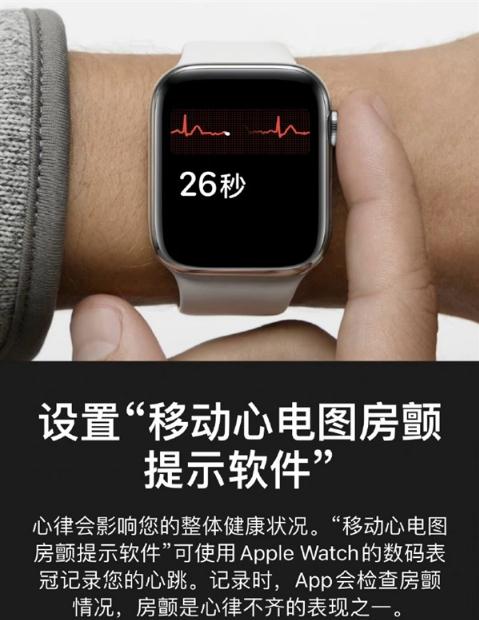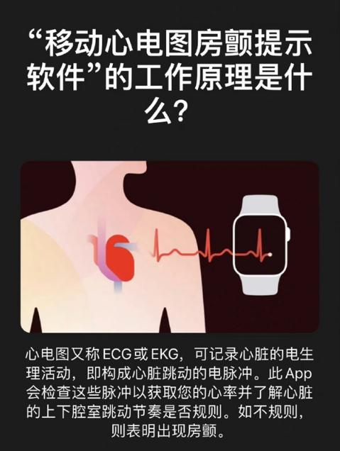 根據蘋(píng)果健康 App 里心電圖功能介紹,如果啟用服務(wù)后,可以在 Apple Watch 上做心電圖,“心電圖 App 使用 Apple Watch 的數碼表冠記錄心跳,然后 App 會(huì )檢查是否出現房顫,心律不齊的一種形式。