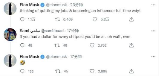 特斯拉 CEO 埃隆?馬斯克在 Twitter 上表示,他正在考慮辭職做一名全職網(wǎng)紅,并詢(xún)問(wèn)網(wǎng)友怎么看。有網(wǎng)友戲稱(chēng),如果他能每條推收費一美元的話(huà),他早就是.... 等等,好像馬斯克本來(lái)就是億萬(wàn)富翁啊!