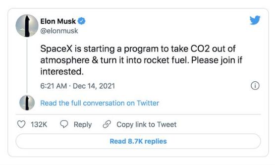 馬斯克發(fā)布推文稱(chēng),“SpaceX 正在啟動(dòng)一項計劃,從地球大氣層中去除二氧化碳,并將其用作火箭燃料。”他補充說(shuō):“如果對這個(gè)項目感興趣,請加入我們。”