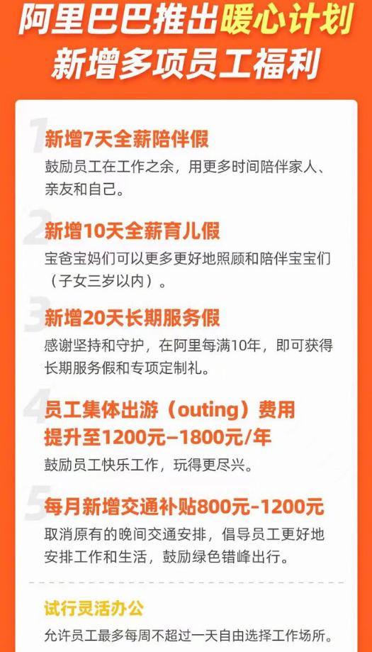 12 月 14 日消息,據悉,阿里巴巴今日在內網(wǎng)公布了多項針對員工關(guān)懷的“暖心計劃”,包含多項員工福利升級——除率先響應國家號召延長(cháng)產(chǎn)假、新增育兒假外,并推出了 7 天全薪陪伴假、20 天全薪長(cháng)期服務(wù)假,同時(shí)新增交通補貼倡導綠色錯峰出行,提高員工集體出游(Outing)費用標準。此外,阿里巴巴還將試行靈活辦公制度,允許員工每周最多一天可自由選擇辦公地點(diǎn)。