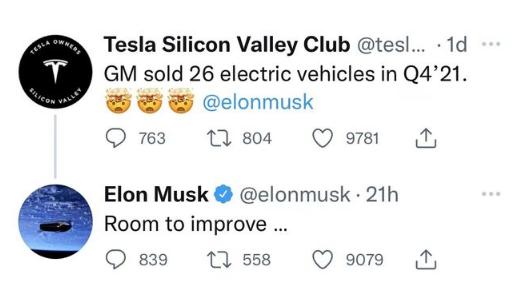 1月6日消息,此前通用汽車(chē)在美國市場(chǎng)的交付數據顯示,通用汽車(chē)去年第四季度共售出26輛電動(dòng)汽車(chē)。當地時(shí)間周二電動(dòng)汽車(chē)制造商特斯拉首席執行官埃隆·馬斯克(Elon Musk)在個(gè)人社交媒體上表示,“(通用汽車(chē))有提升的空間。”