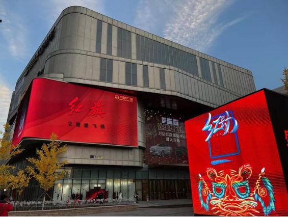 1 月 8 日,界面新聞?dòng)浾邅?lái)到位于豐臺的萬(wàn)達廣場(chǎng),遠遠即可看到 3D 裸眼大屏上一輛汽車(chē),隨后畫(huà)面轉為印有紅旗與萬(wàn)達廣場(chǎng) logo 的紅色旗幟。