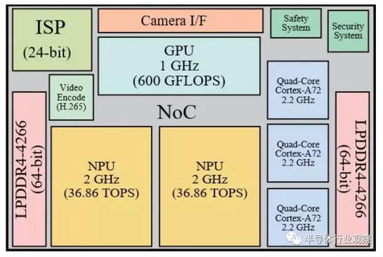 從架構上來(lái)看,FSD 芯片不但有傳統的 CPU 和 GPU 部分,還加入了特別定制的 NNP(Neural Network Processor)、ISP 等部分,共同組成了一個(gè)龐大的 SoC 芯片。其中 CPU 采用的是 Cortex-A72 架構,三組、每組 4 個(gè)核心,一共有 12 個(gè)核心,最高運行頻率為 2.2GHz,這部分處理器核心用于通用的計算和任務(wù)。GPU 方面,特斯拉設計了一個(gè)支持 FP32 和 FP64 的 GPU 模塊,主頻最高 1GHz,最高計算能力約為 600GFLPS。