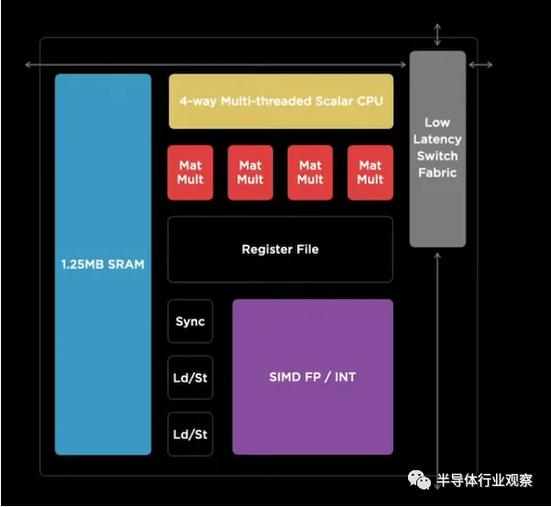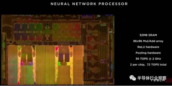 而 NNP 是整個(gè)芯片自研中最重要的部分。每顆芯片有兩個(gè) NNP,每個(gè) NNP 有一個(gè) 96x96 個(gè) MAC 的矩陣,32MB SRAM,工作在 2GHz。所以一個(gè) NNP 的處理能力是 96x96x2(OPs) x2(GHz) = 36.864TOPS,單芯片 72TOPS,板卡 144TOPS。