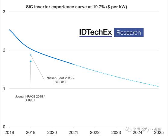 如同其他新型器件一樣,碳化硅逆變器也面臨著(zhù)高昂的成本問(wèn)題,但在特斯拉看來(lái),這或許不會(huì )再成為困擾所在。IDTechEx 根據 2018 年 Model 3 逆變器和 2020 年 Model Y 第二代逆變器的成本估算,在過(guò)去短短三年內,特拉斯的 SiC 逆變器成本大幅下降,其成本幾乎與 2019 款日產(chǎn)聆風(fēng)和捷豹I-PACE 的硅基 IGBT 模塊相當。