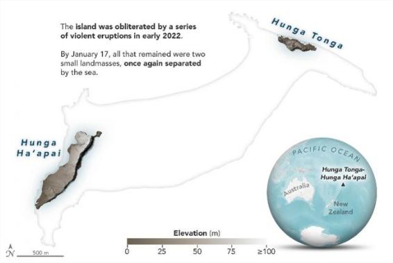 NASA 地球觀(guān)測站的數字高程地圖也顯示了洪阿哈阿帕伊島發(fā)生的劇烈變化。在本月早些時(shí)候火山噴發(fā)前,兩個(gè)無(wú)人居住的島嶼被火山錐合并成一個(gè)新陸地。