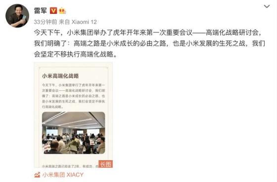 今天下午,小米集團舉行了虎年開(kāi)年來(lái)第一次重要會(huì )議--高端化戰略研討會(huì ),我們明確了:高端之路是小米成長(cháng)的必由之路,也是小米發(fā)展的生死之戰,我們會(huì )堅定不移執行高端化戰略。