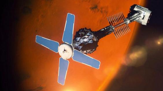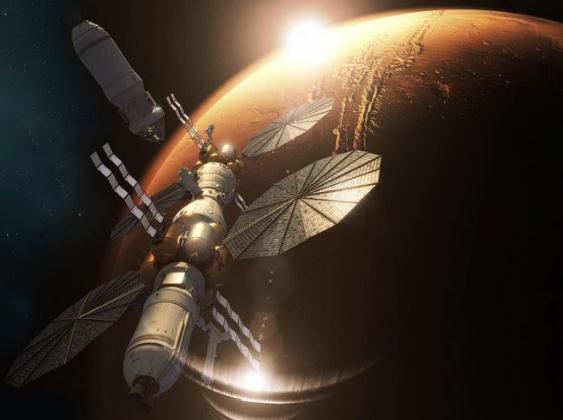 藝術(shù)家對火星軌道上的火星基地營(yíng)的印象。當前往火星的任務(wù)開(kāi)始時(shí),最大的風(fēng)險之一將是空間輻射所帶來(lái)的風(fēng)險。