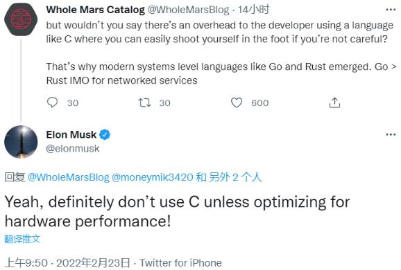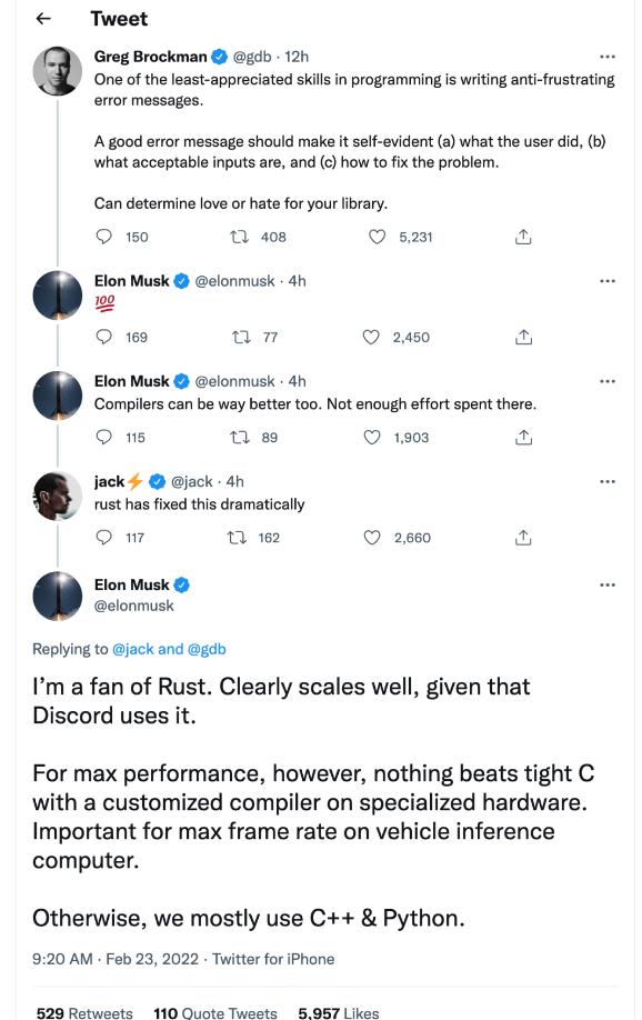 馬斯克也在這條推文評論了自己的看法,他完全同意此觀(guān)點(diǎn),還表示編程語(yǔ)言的編譯器可以做得更好,因為目前在編譯器上的投入還不夠多。