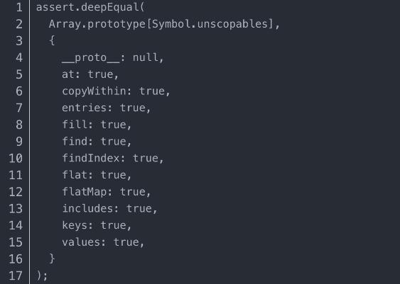 公共符號Symbol.unscopables 允許對象隱藏語(yǔ)句中的某些屬性。它只在標準庫中使用一次,對于 Array.prototype:with