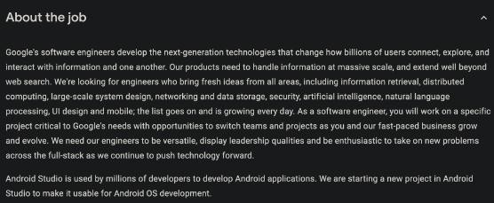在 Google 放出的招聘信息中,我們能夠了解到,Google 希望所有涉及 Android 操作系統的項目都能通過(guò) Android Studio 開(kāi)發(fā)。