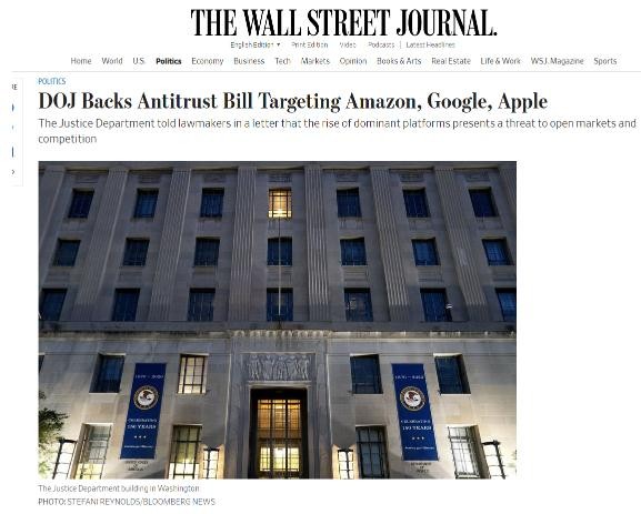 據華爾街日報,美國司法部已在當地時(shí)間周一批準針對亞馬遜、谷歌和蘋(píng)果的反壟斷法案,防止某些占主導地位的科技平臺偏袒自家的產(chǎn)品或服務(wù)。