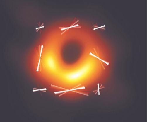 “甜甜圈”狀的結構來(lái)自于黑洞周?chē)e流的輻射——黑洞吞噬了中心區域的光線(xiàn),在“甜甜圈”內形成了一個(gè)大陰影。兩年后,EHT 更新了一張照片,在原有基礎上展示了更精細的結構——表示線(xiàn)偏振方向的紋理線(xiàn),黑洞在線(xiàn)偏振光下的圖像猶如裱花圖樣,被稱(chēng)為“甜甜圈”的裱花版。