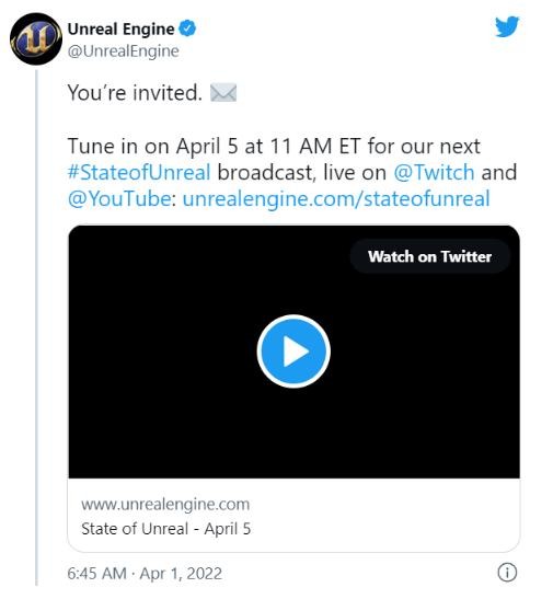 虛幻引擎官方網(wǎng)站上的公告稱(chēng):“在 4 月 5 日加入我們的 State of Unreal 直播,我們將在這里探索游戲未來(lái)的發(fā)展趨勢 —— 并宣布一些令人興奮的消息。”